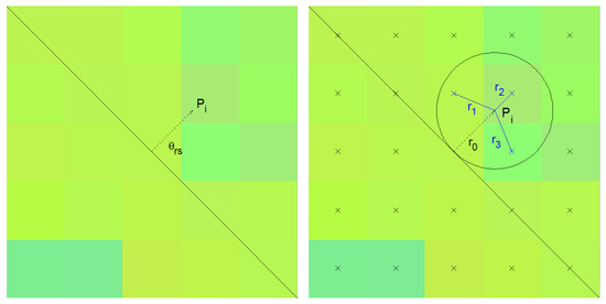 As indicated above, the last parameter of the rule vector represents the action that allows updating the state of cell i. This state is updated by modifying its representative spectrum through a weighted average with the spectrum of some of its neighbors. The neighbors that participate in the average are chosen by following the direction for a distance of one pixel up to point , (Figure 3). The spectra of the set of points located at a distance of no more than one pixel from will contribute to the weighted average together with the spectrum of i, leading to the updated state of cell i, . Here, corresponds to the rotation angle of the rule, s, employed in the calculation of the distance . , on the other hand, is the action parameter of rule s. Thus: