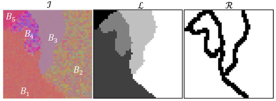 In order to make the description of these error measurements clearer, we will introduce some notation. First of all, let be a training image of size , where is an N-dimensional vector. Let be the ground truth of with , being the set of labels in . Let with be a binary image that defines every pixel as a border {0}, or an interior {1} pixel,. can also be taken as the merging of regions associated with the same label,, where . Using the labeling in , includes two subsets, one containing only interior pixels and another one containing border pixels. Therefore, , where and . can be divided into subsets, with , with comprising the pixels located in the borders between and (Figure 4).