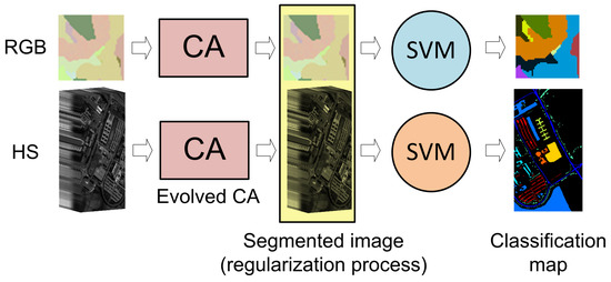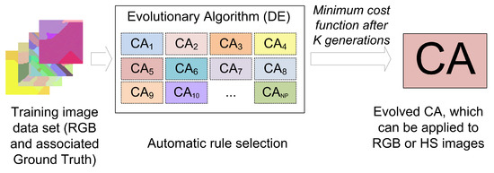 Regarding the application of CAs to hyperspectral images, their potential has still hardly been explored. Some authors have designed CA structures to segment low dimensional images [53,54,55], and some work has been carried out in the high-dimensional image processing area in terms of edge detection [56] or image segmentation [57]. However, in these cases, the set of transition rules were hand created ad hoc and, in order to run them over hyperspectral data, the spectral information was usually projected onto a lower dimension using a PCA or MNF transformation.