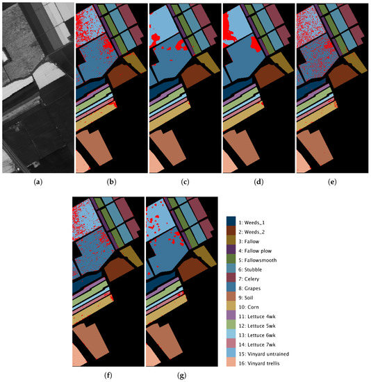 Visual results for all the images are displayed in Figure 21. The images of Figure 21a show the RGB false-color composition for each scene. Figure 21b,c depict a 2D transformation of the original scenes and the segmentation results provided by ECAS-II. The ground truths are presented in Figure 21c and their legends are displayed above the row corresponding to each scene. Figure 21e,f represent the SVM based classification applied to both the original scene and the segmented one provided by ECAS-II. In these last images, only the labeled areas are colored in gray and misclassified pixels are colored in red of varying intensity (a brighter red pixel means that it has been misclassified more times when the SVM algorithm has been repeatedly applied 10 times).