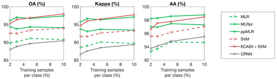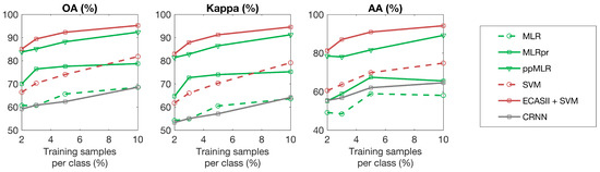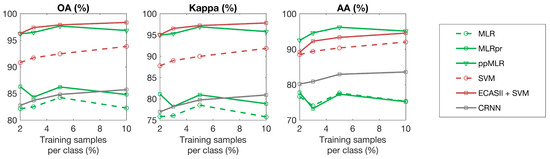 Classification accuracies (%) for different algorithms applied to the Indiana scene using different numbers of training samples.