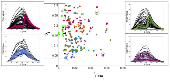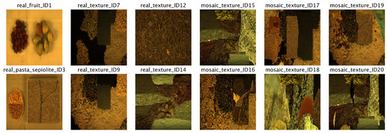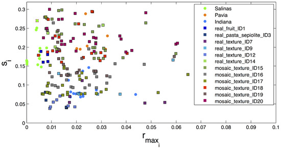 The images from the GII-HSEG repository (Real hyperspectral images from the GII-HSEG repository are available at http://gii.udc.es/gii_hyperspectral_repository) cover different types of scenarios: isolated low-textured objects on a light background, isolated highly-textured regions on a light background, adjacent highly-textured regions without a common background and objects half-buried under materials of great heterogeneity and profuse texture. Figure 18 graphically shows the spectral variations between different scenes, by representing the image feature parameters in terms of the averaged intra-class distance of each class vs. the averaged inter-class distance between each class and the rest of the classes in terms of normalized spectral angle (between 0 and 1) for the Pavia, Indiana, Salinas scenes and some images from the GII-HSEG repository (Figure 19). In this graph, it is easy to see that the hyperspectral image labeled as real_texture_ID7 exhibits high intra-class distances () keeping the inter-class distances () low. On the other hand, image real_fruit_ID1 presents low spectral distances between pixels belonging to the same class, but the spectral distance between pixels from different classes is quite high. The idea here was to select images aiming to complement the spectral parameter space. It can be noticed that there are no points in the spectral parameter space for which . This is because of the difficulty of setting up a scene in which pixels belonging to the same class are more spectrally heterogeneous than the spectral differences between pixels from distinct classes. For a better grasp of Figure 18, in Figure 20, the spectra of some pixels belonging to the real_texture_ID7, real_texture_ID12, mosaic_texture_ID15 and mosaic_texture_ID20 scenes are shown. For each graph, the spectra of randomly selected pixels belonging to a certain class from the corresponding scene are plotted in color following the legend of Figure 18, while the spectra from the remaining classes for the same scene are plotted in black. It is worth noting that, for example, in the case of the real_texture_ID7 scene, the spectral distances between pixels belonging to the same selected class are almost the same as the ones with respect to pixels from the remaining classes, which is in line with a high value of and a low value of .