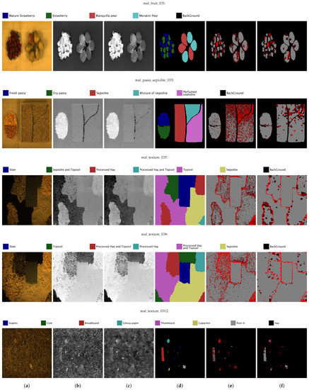 All of the SVM results applied to the original or segmented scenes demonstrate that the selected use cases (discrimination between types of fruits, degree of ripeness, etc.) are appropriate to benefit from hyperspectral technology. The improvement that the ECAS-II segmentation step introduces in the accuracy performances depends on the spatial and spectral characteristics of the scene. When the regions exhibit high levels of spatio-spectral textures, the inclusion of spatial information is highly relevant in order to obtain better classification performances. This is more noticeable in the real_pasta_sepiolite_ID3 and real_texture_ID12 images, where the increase in the accuracy measurements is , , and , , , respectively. In the real_pasta_sepiolite_ID3 image, the difference between sepiolite and perfumed sepiolite classes is an added purple-colored component of much lower granularity that gives off the smell of the perfumed sepiolite and is responsible for the salt-and-pepper noise in the classification result of directly applying the SVM to the original scene. In image real_texture_ID12, the fact that objects are half-buried poses a further difficulty for the classification task, and the reason for the worst result in terms of accuracy performances for the SVM applied to the original image. However, the inclusion of spatial information by means of the ECAS-II segmentation step significantly improves the classification accuracies for these cases.