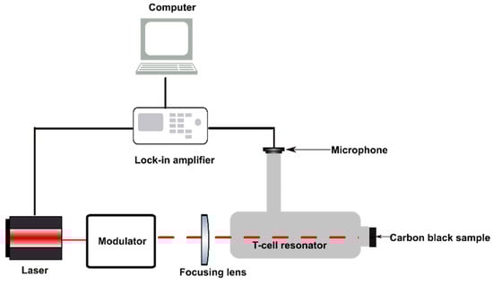 The photoacoustic resonator consists of three interconnected cylinders as shown in Figure 2. A small absorption cylinder is longitudinally connected to a cavity cylinder, on which a resonance cylinder had been perpendicularly mounted, thus forming a T-like structure. The right end of the resonator where the laser beam enters is sealed using a polycarbonate window with an optical transmission of 85% in the visible region. The carbon black probe is pressed into the absorption cylinder, thus sealing the left end of the resonator. The upper end of the resonance cylinder is sealed by the microphone and its mounting.