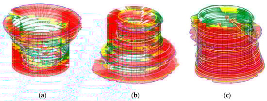 The unevenness of the diameter of the resonance cylinder, the absorption cylinder, and the cavity cylinder (left to right) resulting in asymmetrical cylinders []. The nominal values of the diameters are 2.0 mm, 2.5 mm and 8.0 mm respectively. Red/yellow/green: Deviation of the measured value and the nominal value larger than/similar to/smaller than 10 µm, respectively.
