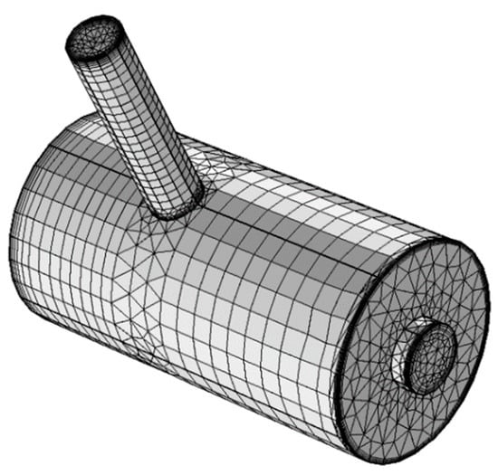 The design of the resonator is initially generated and meshed. We applied swept meshes in the resonance cylinder and in parts of the cavity cylinder, while a triangular mesh was used in areas of the resonator where a swept mesh could not be used. A structured mesh with swept meshing was chosen to reduce the number of mesh elements and enable faster computation. Even though the AME model does not require boundary layers, they were generated throughout the resonator since the same mesh was used for the VT model. A convergence study performed for the AME model indicated that the mesh depicted in Figure 4 is sufficient to obtain a good approximation to the actual solution.