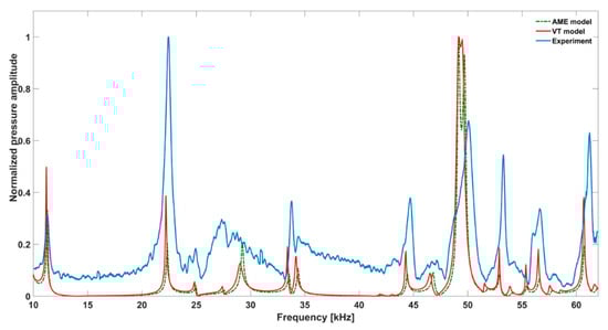 The frequency responses of the amplitude mode expansion (AME) model, the viscothermal (VT) model and the experimental measurement in the high frequency range.
