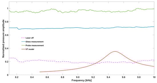 Unlike the simulation, the measured response curve in Figure 7 does not clearly show a resonance between 8 and 10 kHz. The signal difference between the laser off measurement (red) to the glass measurement (green) supports our assumption that there is window and cell wall excitation.