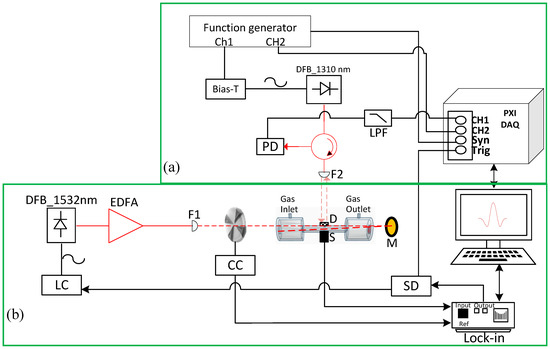 Experimental measurement setup: (a) PGC interferometer. DFB_1310 nm, DFB laser at 1310 nm; PD, photodetector; LPF, low pass filter; DAQ, data acquisition; and F1, F2 collimators. (b) Photoacoustic system. DFB_1532 nm, DFB laser at 1532 nm; LC, laser controller; EDFA, erbium-doped fibre amplifier; CC, chopper controller; D, diaphragm; S, microphone; M, mirror; SD, signal divider; Lock-in amplifier.