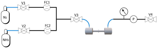 Different NH3 concentration levels within the 0–5000 ppmv range were achieved by dynamic dilution of a certified 5000 ppm NH3 calibration gas with ultra-high purity N2 using a custom-made gas mixing and conditioning system, as shown in Figure 4. It was comprised of two mass flow controllers (F-201CV, Bronkhorst) with maximums flow rates of 600 L/min (FC1) and 60 L/min (FC2). For the experiments, the pressure inside the system was kept at 1 atm, while the flow was maintained at 60 mL/min, which provided a maximum concentration uncertainty of 2.8% at 30 ppm.