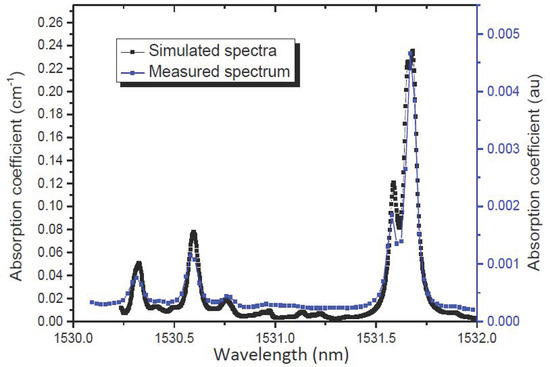 In order to identify the gas trace, a distributed feedback laser diode was employed, and the temperature and current were adjusted to obtain the maximum emitting power and specific wavelength. Coarse wavelength tuning from 1530.8 to 1532 nm at a 70 mA fixed laser current can be achieved by increasing the laser temperature from 20 to 30 °C and fine frequency tuning in the range of 0.1 nm was accomplished by changing the laser current from 90 to 100 mA. The most intense absorption band for NH3 in the spectral region between 1530 and 1532 nm, with the strongest line centred at 1531.68 nm. Figure 5 shows HITRAN2016 (High-resolution transmission molecular absorption database) simulated absorption coefficient for rotational–vibrational transitions in the combination band v1 + v3 and the overtone 2v3 [29] for the range chosen. The experimental identification of the absorption line was made by measuring the photoacoustic signal using the theoretical modulation frequency of 1.8 kHz and detecting the signal with the electrical microphone inside the resonant cell with 5000 ppm NH3. This is plotted in the same figure for current from 10 to 100 mA and at 16 to 30 °C, which is equivalent to a range of approximately 2-nm wavelength.