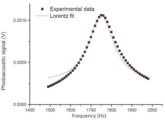 The resonant frequency characterization of the gas cell was accomplished using a mechanical chopper to modulate the intensity of the optical signal at different frequencies. The gas cell was filled with NH3 at 5000 ppm. The laser wavelength was set in the vicinity of the NH3 absorption line (around of 1531.7 nm), using an optical spectrum analyser to identify the wavelength and the frequency modulation was changed in the range of 1.5 to 2 kHz to examine the resonant frequency of the aluminium resonant gas cell. The frequency response is depicted in Figure 6 and the results were fitted by a Lorentzian distribution to determine the quality factor and the resonance frequency. The maximum peak for the photoacoustic signal was identified at 1755 Hz and a quality factor of 10 was obtained for the cell with the electrical microphone.