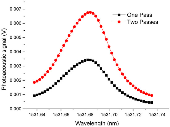 To improve the detection of NH3, the optical beam is passed through the cell two times (filled with 3000 ppm of NH3) and the laser wavelength was tuned from 1531.64 nm to 1531.74 nm. The chopper frequency was set stablished at the cell resonance frequency (1.75 kHz). A mirror was set at the end of the cell to reflect the laser beam back to the cell. Laser and mirror were installed on Ø1" and Ø0.5" Kinematic Mirror Mounts, respectively, and multi-axis manual translation stages to optimize the signal with two passes. The optoacoustic signal for one and two passes are shown in Figure 7, which shows an improvement in the amplitude of the photoacoustic signal by approximately a factor of 2 [30].