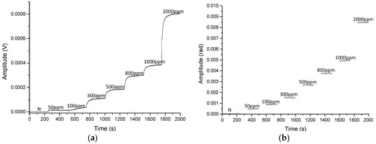 Calibration curve of 0–2000 ppm NH3 for electrical microphone (a) and optical microphone (b). Note that while the concentration is stabilized, the data in (b) are not represented.