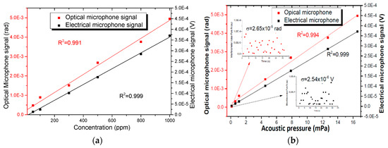 The signal amplitude as a function of NH3 concentration is plotted in Figure 9. The calculated R2 value, which represents how well the regression line approximates real data points, is approximately 0.991 and 0.999 for the optical and electrical microphone, respectively. After a linear fitting procedure, excellent linearity was achieved for the two sensors. A sensitivity of 4.65 × 10−6 rad/ppm was obtained for the optical microphone implemented with a diaphragm and a PCG interferometer.