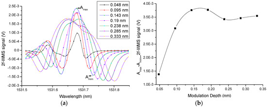 (a) 2f-WMS Photoacoustic signal for modulation depths from 0.048 nm to 0.333 nm of the same NH3 absorption lines. (b) Peak to peak 2f-WMS photoacoustic signal as a function of the modulation depth. All measurements were performed with a 5000 ppmv NH3 in N2 mixture, atmospheric pressure, room temperature and a 300 ms lock-in amplifier time constant.