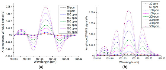 For evaluating the limit of detection (LOD) of the sensor prototype, different NH3 concentration levels within a range from 0 to 500 ppm were prepared by diluting a certified 5000 ppm NH3:N2 calibration mixture with 5.0 N2 (99.999%). Each concentration step was measured with the electrical microphone and with the optical microphone. The 2f signal was acquired and processed with a lock-in time constant of 0.3 s, a filter slope (roll-off) of 24 dB/octave, and a PXI DAQ with a 12 MHz sampling frequency, a block size of 40000 samples and averaging of 32 samples, respectively. The measured 2f-WMS signal (Amplitude and x-component) corresponding to different NH3 concentration levels and the linearity plot of the microphone sensors are demonstrated in Figure 11. The R2 value to experimental data is 0.992.