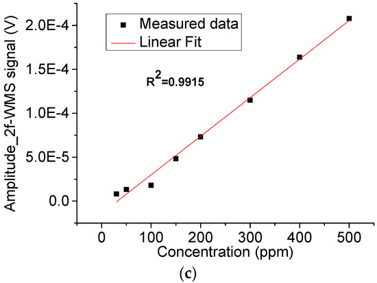 The resulting 2f-WMS amplitude curve normalized to the bandwidth detected by the optical microphone is plotted in Figure 12. Good linearity is observed between signal and NH3 concentrations for the optical microphone (R2 = 0.995).