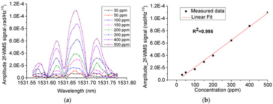 Amplitude (a) and linear fitting (b) of 2f-WMS Photoacoustic signal measured by optical microphone for different NH3 concentrations. The pressure is set to 1 atm, and the temperature to 296 K.