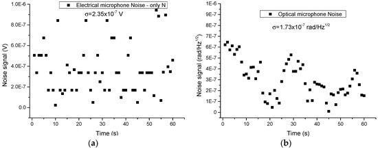 Noise signal for the acquired 2f-WMS photoacoustic signal for pure N2. (a) Electrical microphone and (b) Optical microphone.