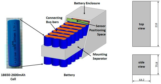 Entire battery pack dimensions without connection busbars and terminals, are 60.2 mm × 206 mm × 65.8 mm. The battery pack module is placed in a hermetic outer enclosure (Figure 1), with dimensions as follows: 64.2 mm × 210 mm × 75.8 mm. Sensors are placed inside the enclosure, over the connecting busbars.