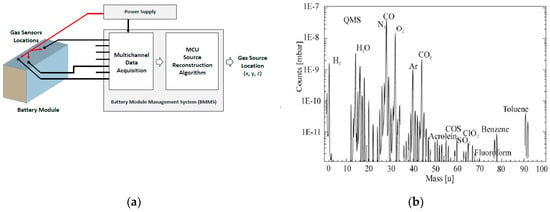 Battery management system block diagram (a); quadrupole mass spectrometry (QMS) analysis of lithium-ion battery destructive gas leakage (b) [4].