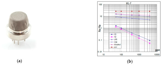 MQ-7 sensor outlook (a); and output MQ-7 sensor characteristics (b) [16].