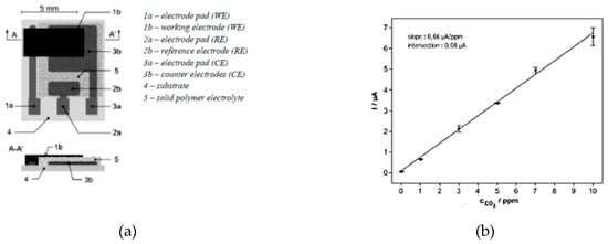 Sensor layered design (a); and output characteristic of the BE3 sensor platform (b) [15].