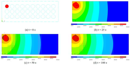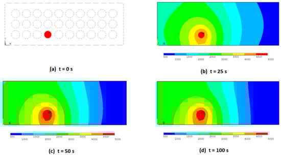 Time-dependent simulation results for CO gas leakage distribution are obtained and are shown in Figure 7. Gas source is marked in red in Figure 7a; it is placed in the middle of the pack, where circles are battery elements in top view. Tested source concentration is 5000 ppm (5823 mg/m3) for 100 s time interval with 0.25 s time step.