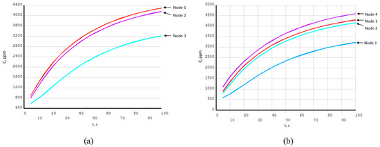Gas concentration values are taken at sensor array nodes positions, as they are described in Figure 6. These transient gas concentration changes in sensor nodes for four sensor array configurations are shown in Figure 9 and Figure 10. Concentration values are related to the distance to the gas source location and battery pack wall distance. These dynamic data are suitable for source location reconstruction method calibration and error estimation.