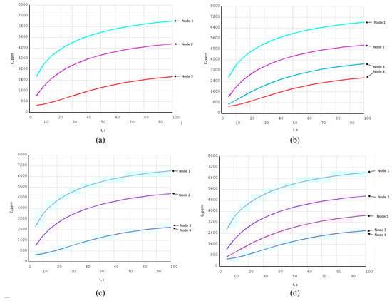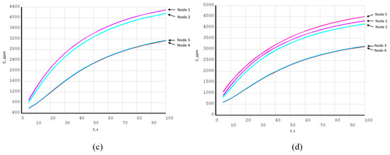 Results shown in Figure 10 are corresponding to Figure 8 gas source location. Tested source is with 10,000 ppm (11,646 mg/m3) concentration for 100 s time interval at 0.25 s time step. Concentration values are taken at sensor nodes positions, where the sensor array configuration patterns are: Three nodes in Figure 10a, four nodes in Figure 10b, four corner nodes in Figure 10c, and five nodes in Figure 10d. Node numbering is according to Figure 6.