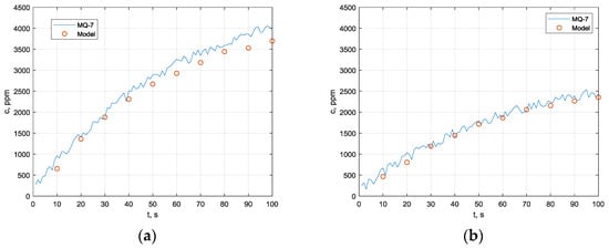Experimental validation of modeled results is performed with the MQ-7 [15] sensor. For sensor calibration, digital carbon monoxide meter M0198108 is used; calibration is up to 1000 ppm concentration. Sensor output voltage drop signal is acquired by NI DAQ USB- 6009 data acquisition device and NI LabView virtual instrument. Measured results at two different distances are shown in Figure 11a,b (50 mm, 100 mm). Estimated uncertainty in comparison with the computational model is below 12% of maximum concentration level.