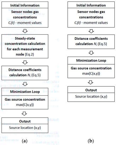 Reconstruction algorithm sequence diagram is shown in Figure 12. Two modifications are considered; the first one (Figure 12a) uses steady state gas concentration predicted by Equation (3). In the second one, modification is using currently measured gas values, registered by the sensors in real time (Figure 12b).
