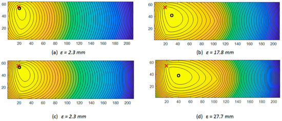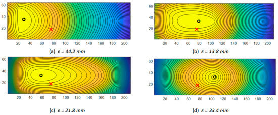 Reconstructed concentration maximums by steady-state concentration algorithm, concentrations for three-node (a), four-node (b), four-corner-node (c), and five-node (d) sensor array configurations. Red crosses represent the original known source location (Figure 8a); the black circles re point to reconstructed maximum concertation. For each node scheme, absolute distance between original and reconstructed source location—ε is calculated. Values of ε that are smaller than 18.6 mm are accurate enough to locate a single element as a source of gas emission.
