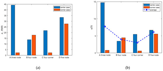 Uncertainty of reconstructed gas source location—ε (a), and uncertainty per measuring nodes number—ε/n (b). Blue bars correspond to central source case; red are for near corner located source case. Average uncertainty minimum is in four-node configurations.