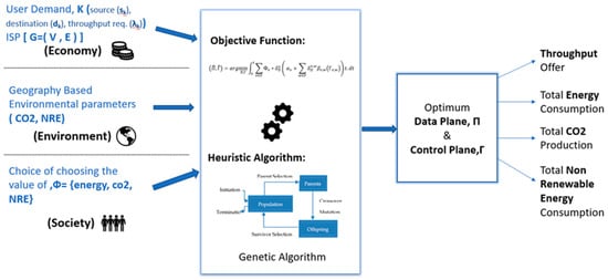In this paper, we have also proposed a sustainable solution for the problem of achieving ‘green networking’. As explained in Section 2, a solution cannot be sustainable without addressing the three pillars of sustainability. In the section above, EAR and PAR are described. Our solution, depicted in Figure 4, integrates all these elements in order to address the ‘green networking’ problem. Through our solution we would like to investigate the performance of the proposed approach (PAR) and the available approach (EAR). We have designed the solution keeping in mind the three pillars of sustainability, namely economy, environment and society. Figure 4 shows the architecture of the proposed system. In the following part, how the three pillars are integrated into our solution is described briefly. Firstly, our system takes traffic demand from users and the topology of the network from the Internet service provider (ISP) as input. Both users and ISPs are the stakeholders for our solution. ISP has a direct relation with the profit, whereas users are mainly concerned about the quality of service (QoS) like throughput requirements. We also take geography-based environmental information such as carbon emission factor (CEF) and non-renewable energy usage percentage (NRE) as input. This information is one of the key factors for providing a green outcome. These environmental parameters are acting as the second pillar of sustainability–environment. Lastly, our system provides a user of this system the ability to choose to select a solution focusing on either reducing energy consumption or CO2 emissions or non-renewable energy usage percentage (the value of Φ in Equation (8)). The social aspect of sustainability focuses on balancing the needs of the individual with the needs of the group. By giving the choosing ability to the Internet service providers, it integrates the social entity of the sustainability into our system.