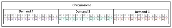 The crucial part of applying GA to a problem is to design a chromosome according to the problem. Later these will create a population pool. Each chromosome represents a single candidate solution of the search space. In our case, the data plane is converted into a chromosome as a data plane contains a solution set for each demand following the capacity constraint. Therefore, in order to build a chromosome pool, we have created a set of data planes. To do that, we have used another heuristic which is randomized depth first search (RDFS). RDFS randomly selects the next node for going into next level into the tree. Simple DFS is unable to create a diverse solution set. Therefore, RDFS is used to find the path for each demand and then that path is added to create the solution set. RDFS considers the current state of the topology capacity wise. Then, all the solutions that are found, follow the capacity constraint. Once we have a data plane then we can convert the data plane into chromosome. If we have a set of demand k = {1, 2, 3, …, k} and if a topology has E number of edges {1, 2, 3, …, E} then in a chromosome consists of k*E number of 0’s and 1’s. Where 0 represents this link is not used for fulfilling this demand and 1 represents this link is turned on for fulfilling this demand. Figure 6 shows the structure of the chromosome. This chromosome is actual representation of the example with three demands that we discussed in Section 4.1. In our initial population pool, we have always included one solution achieved by using SPF. Therefore, a population pool with a size of N has N-1 chromosome gathered by RDFS and the other one is using SPF.