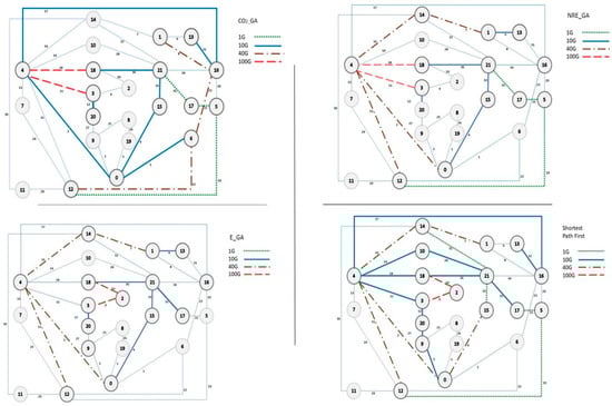 For the last decade or so, several approaches are made in order to achieve green networking. The authors of [10] provided a detail discussion on the different research trends in green networking. Research works like [11,12] focus only turning off links and line cards whereas many other papers like [13,14,15] focus on turning off both links and nodes. Authors in reference [4] proposed a novel heuristic, GreenTE, which maximizes the power savings and satisfies the quality constraints including link utilization and packet delay. The proposed a heuristic solution that is proactive in terms of path calculation. They have defined a set of previously calculated paths and they chose the solution from one of them. Authors in references [12,13] emphasize least link and least flow without link adapting. They have used a greedy algorithm to find out the least used link or devices with the least flow and then turn them off. They did reactive path calculation. This means that based on the heuristic several paths are being calculated instantly and the best one for the particular scenario is chosen. Works like [15], provide a clear idea about how an optical core network behaves in terms of energy consumption. On the other hand [16,17,18] all talked about implementing ALR in order to reduce energy consumption. Other works like [12,13,19,20,21] all have considered energy aware routing. Authors in reference [20] provided a greedy algorithm-based heuristic and along with links they have also focused on reducing the energy consumption by turning off nodes. Nevertheless, in their solution they have not considered ALR. In current times alongside these solutions various other solutions have been proposed using SDN in order to benefit from the global knowledge of the central controller. Authors in reference [14] proposed an incremental greedy algorithm-based solution where a controller dynamically adds nodes and links to the initial small topology network in order to satisfy user demand requirements. Authors in reference [22] also proposed an energy efficient solution combining energy aware routing with SDN-based Ethernet networks. There are also a few works which have taken a different approach towards green networking. Authors in references [23,24,25] all have tried to achieve green networking in data centers by using renewable energy. Authors in references [23,24] changed the destination node based on availability of the renewable energy and on the other hand in [25], alongside with renewable energy, other criteria like geographical load balancing and server speed scaling are considered. The authors of [26,27] proposed a similar eco-friendly routing idea using renewable energy where they have used clustering to choose a cluster head with most renewable energy and then choose the member node accordingly. Authors in reference [26] is for wireless networks and [27] is for IP networks. However, one thing is common in the abovementioned works is that all of them consider green network that same as the energy efficient network. They have all tried actively or passively to reduce the energy consumption in order to get an energy efficient network. However, even if energy has a link to sustainability issues, its direct impact on the environment in terms of air pollution and Earth’s resources is not explicitly specified. Therefore, in our work we have introduced two different green metrics–CO2 emission and non-renewable energy usage percentage–and make a comparison between them and energy efficiency approaches.
