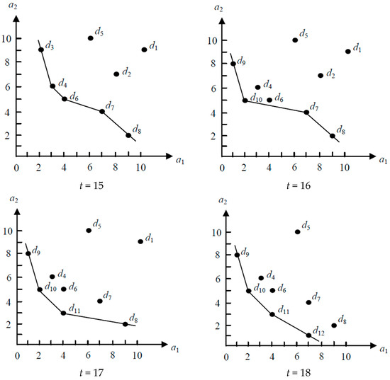 The example of a continuous skyline query being shown in transition from times 15 to 18.