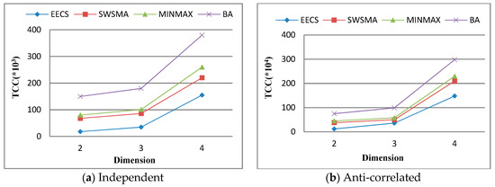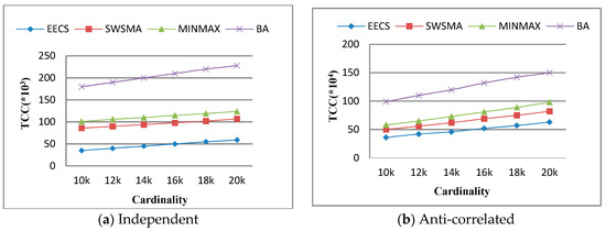 Then, we study the effect of cardinality on total communication cost (TCC). Figure 5 illustrates that TCC as a function of the cardinality of dataset over independent dataset and anti-correlated dataset when other simulation parameters are set to their default values. The results show that TCC of each method increases accordingly with the cardinality of dataset. This is because the increase in the cardinality of dataset leads to the corresponding increase in the amount of data objects processed and transmitted by sensor nodes. We can see from Figure 5 that EECS is obviously better than the other three methods in terms of TCC. The reason is EECS is optimized for filtering strategy and skyline incremental maintenance.