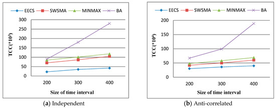 Finally, we study the effect of query time interval [ts, te] on total communication cost (TCC). Figure 7 depicts TCC as a function of query time interval over independent dataset and anti-correlated dataset when other simulation parameters are set to their default values. The results show that TCC of each method increases accordingly with the size of query time interval. This is because the increase in the size of query time interval leads to an increase in the number of skyline queries. We can see from Figure 7 that EECS significantly outperforms the other three methods in terms of TCC. The reason is the same as the one for Figure 5.
