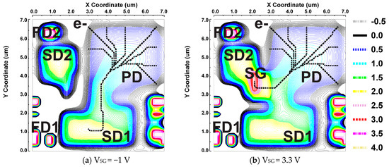 In the actual pixel layout patterns, the n2 doping layer is extended to the center of the PD for creating a distinct built-in drift field to transfer all the photo-electrons to the site close to the SG gate, and the n3 doping layer is shaped for making the perfect charge transfer from the SD1 and SD2 to the floating diffusion nodes, FD1 and FD2, respectively, easier. Another important design issue of this pixel is the charge splitting capability by the SG gate. Ideally, the SG and the structure near the SG gate must be designed such that all the photo-electrons created in the PD are transferred to the SD2 when the SG is turned on and to the SD1 when the SG is turned off. Figure 6 shows simulated 2-D potential plots of the pixel for the SG turned off (Figure 6a) and the SG turned on (Figure 6b). The gate voltages of the SG are 3.3 V and −1 V for turning on and turning off, respectively. A device simulator, SPECTRA [17] (Link Research Corp.), was used for these and the following simulations. These 2D potential plots show the maximum potential in the depth (z-axis) range from 0 to 3 μm. Electron paths initiated by eight surrounding points of the photodiode are also shown when the SG is −1 V and when the SG is 3.3 V. This helps to understand that photo-electrons generated in the photo-diode area are mostly once gathered to the center of photodiode and then transferred to the final destination, that is, the inside of the SD1 with the SG of −1 V and the inside of the SG with the SG voltage of 3.3 V.