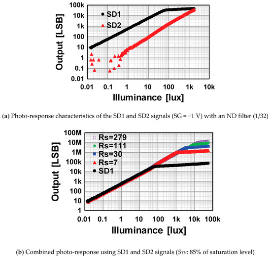 Figure 12a shows the measured linearity characteristics for the SD1 and SD2 signals for the Rs of 30. To find the linearity of the SD1 signal at the noise level, a Neutral-Density (ND) filter with the attenuation ratio of 1/32 was used. The measured temporal noise in the SD1 signal was 3.2e−. With this noise level, the minimum illuminance level at which the SNR was 1 (0 dB) was 0.07 lux. The saturation level of the SD2 signal was 3 klux Therefore, the dynamic range with this setting was 92.6 dB. Figure 12b shows linearity plots for the combination of the SD1 and SD2 signals using Equation (4). The lowest sensitivity ratio of the SD2 to the SD1 signals was 1/107 for the Rs of 279. With this setting of the SD2 sensitivity, the saturation level of the SD2 signal was 14 klux, and the attainable maximum dynamic range is as 104 dB.