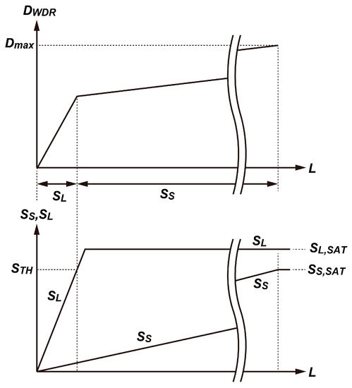 Graphical expression of Equation (7) (relationship between DWDR and illuminance (L) together with the curves for SL and SS versus L).