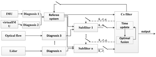 On this basis, a multi-information fusion scheme based on no-reference system fault detection is proposed, as shown in Figure 4. First, according to the fault detection results, the inertial navigation system is preferred to establish the state equation, and the sub-filter is established by combining the measurement equation of the corresponding sensor sub-system. Second, the corresponding fault detection values are obtained through the no-reference fault detection method to judge the fault situation of each sub-sensor. Third, based on the fault judgment results, the corresponding sub-filter is selected and the state recursive results during fault detection are combined to carry out the next federal filtering algorithm. Fourth, the corresponding fault detection values are obtained through the no-reference fault detection method to judge the fault situation of each sub-sensor. Finally, based on the fault judgment results, the corresponding sub-filter is selected and the state recursive results during fault detection are combined to carry out the next federal filter algorithm.