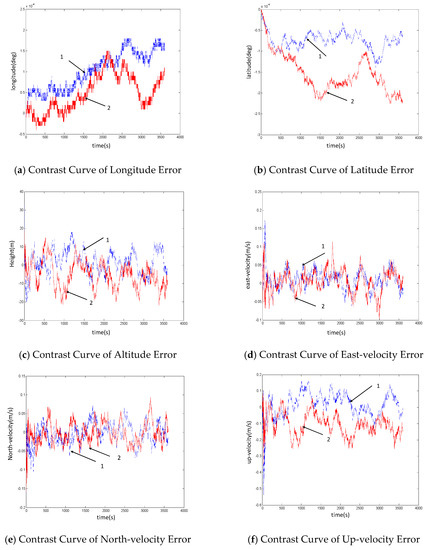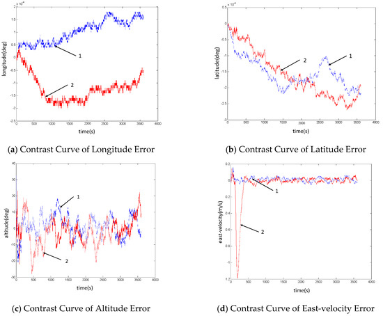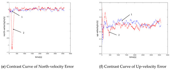 The results of self-adjustment fusion in the case of fault of measurement information are shown in Figure 5. The blue dotted line ‘1’ in the figure represents the navigation results in the case of fault-free of the system, and the red solid line ‘2’ represents the navigation results in the case of fault of optical flow sensor. Among them, the fault occurs between 900 and 940 s.