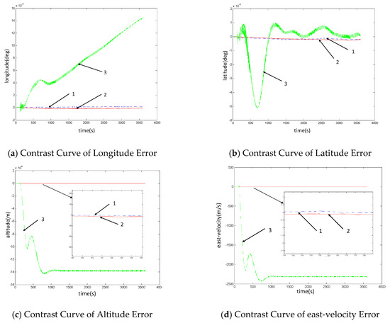 In order to illustrate the necessity of fault detection based on the no-reference system, this section assumes the fault of the inertial sensor, and carries out simulation analysis on the three cases of fault-free, fault judgment and isolation, and fault undetermined. The comparison of fusion results is shown in Figure 7. The blue dotted line ‘1’ in the figure represents the navigation results in the case of fault-free of the system, the red solid line ‘2’ represents the self-regulation fusion navigation results in the case of fault of the inertial sensor, and the green dotted line ‘3’ indicates the navigation result of the system when the inertial sensor fails but is not isolated.