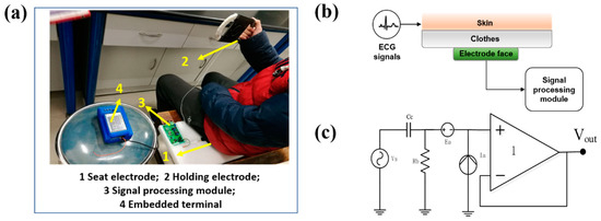 (a) Non-contact ECG monitoring system; (b) Schematic diagram of the capacitive coupling electrode; (c) Equivalent circuit diagram of the electrode.