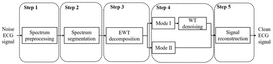 In this section, we will introduce the proposed method based on EWT-WT. The flowchart of the proposed method is shown in Figure 2. It consists of five parts, namely, spectrum preprocessing, spectrum segmentation, EWT decomposition, WT denoising, and EWT reconstruction. The detailed discussion is introduced in the following description.