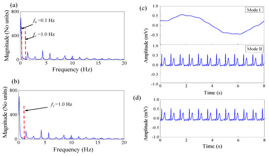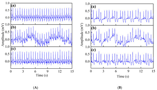 Several approaches to motion artifact removal in ECG signals have been previously reported, including adaptive filter (AF) [4,5,6], wavelet transform (WT) [7,8] and empirical mode decomposition (EMD) [9,10]. Generally, the practical method of removing motion artifacts is to employ a low-pass filter to process the signal. The adaptive filtering can eliminate the noise without signal distortion by using the deterministic function as a reference signal [11,12,13,14]. However, the adaptive filtering to remove ECG motion artifacts is limited due to the need for accurate reference signals as a prerequisite.